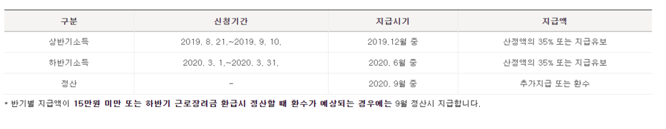 반기별 소득이 파악이된 근로소득자에 한하여 당해연도 소득을 기준으로 근로장려금을 반기별로 신청