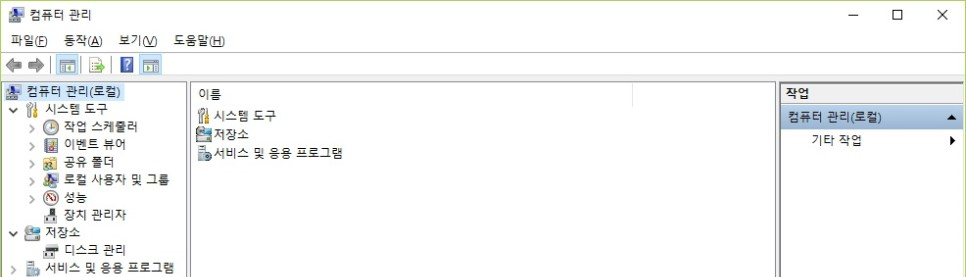 왼쪽 화면애서 저장소 ->디스크 관리 메뉴 -> 클릭
