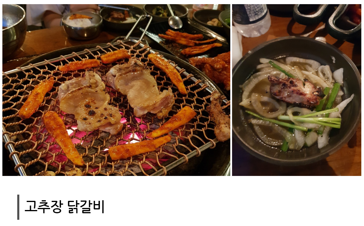 토담 닭갈비는 허벅지 살을 소갈비처럼 허벅지뼈를 살려서 길게 만들었더라구요 :) 닭이라는 재료만 다를뿐 일반갈비와 같은 비주얼인데요
