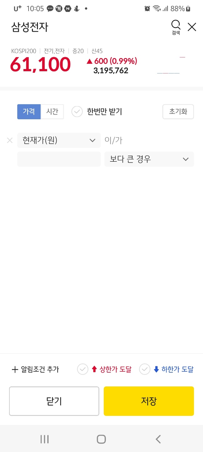 다양하게 설정을 할 수 있게 되어 있어서, 원하는 금액 또는 등락률을 선택하고 저장하시면 됩니다~