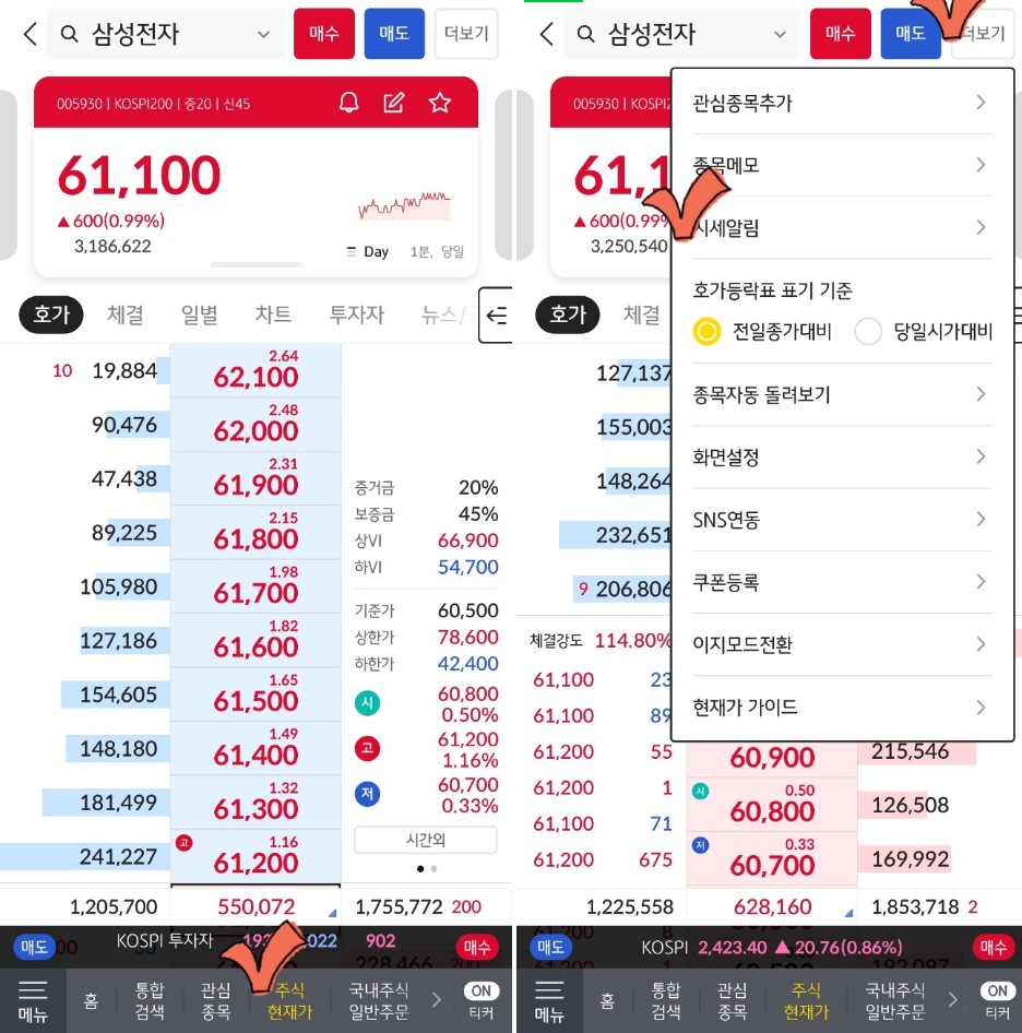 모바일에서 M-able 앱 접속 - 하단에 있는 주식현재가 - 상단에 있는 더보기 - 시세알림 순으로 선택합니다
