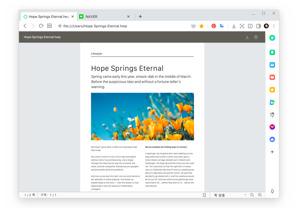 hwp 파일을 네이버 웨일에 드래그 & 드롭하면 브라우저에서 바로 보기 가능이 추가가 되었어요